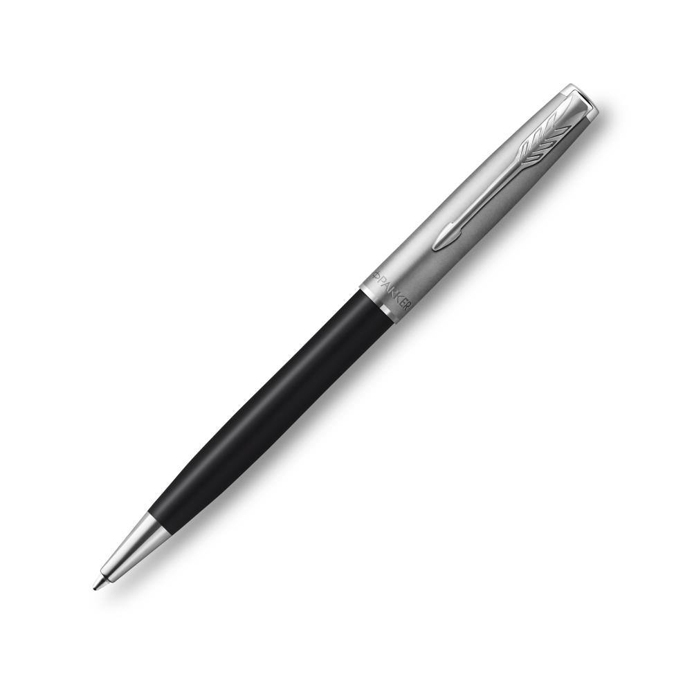 Kemični svinčnik Parker SONNET.#13#10- Ohišje iz črnega laka s paladijevimi zaključki.#13#10- Z izvlečnim zasučnim mehanizmom.#13#10- Pisalo je ročno sestavljeno in natančno preverjeno, da zagotovi vrhunsko izkušnjo pisanja.#13#10- Konica debeline M, črno črnilo.