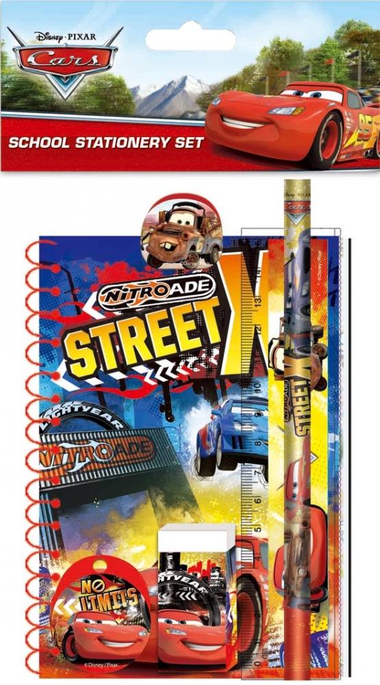 Set otroški Disney Cars vsebuje ravnilo, svinčnik, šilček, špiralni blokec, radirko in sponko
