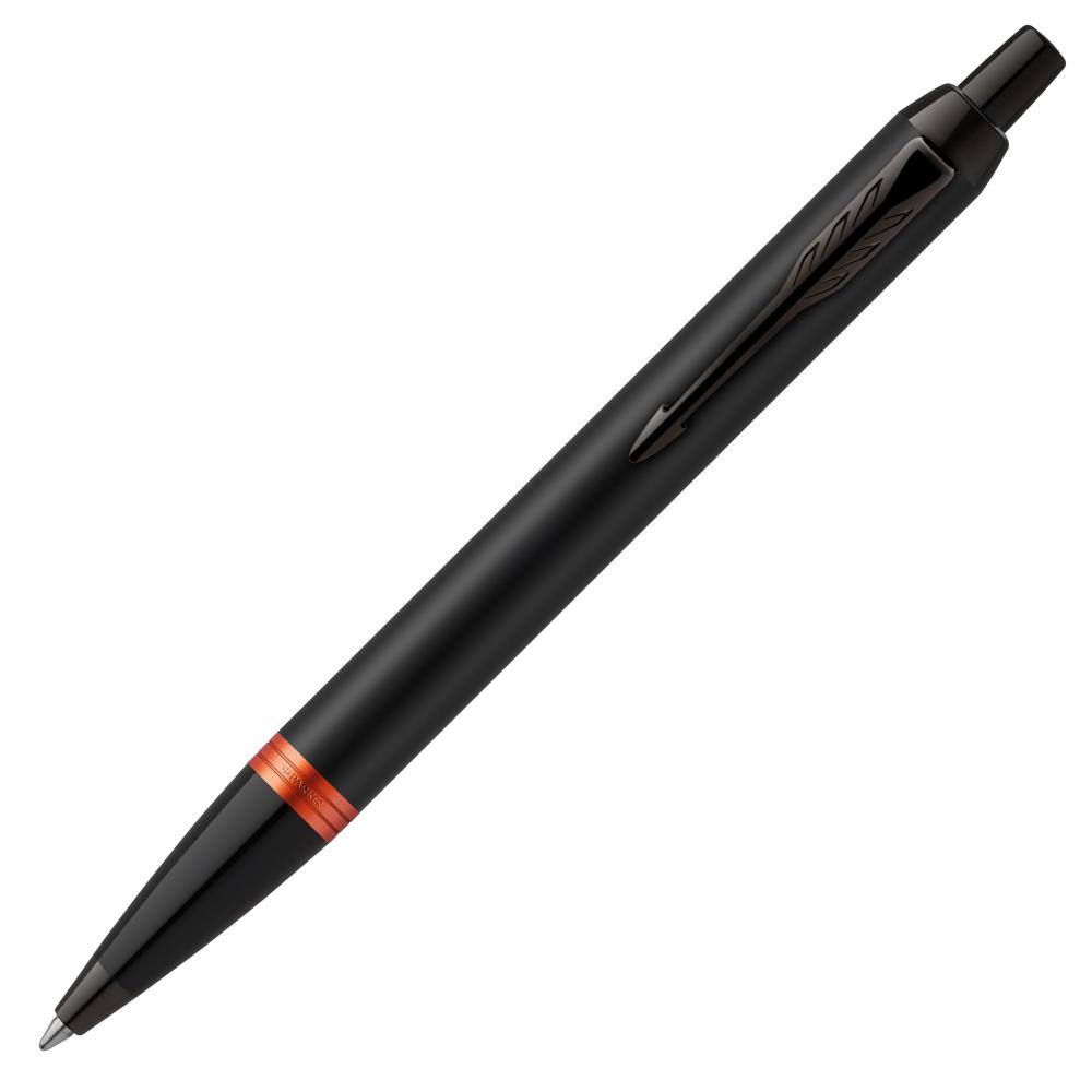 Kemični svinčnik Parker IM Achromatic v črni barvi z oranžnimi obročki.#13#10- Ohišje iz mat črnega laka.#13#10- PVD prevleka sponk in obrob proti obrabi in eroziji.#13#10- Debelina konice M, modro črnilo.