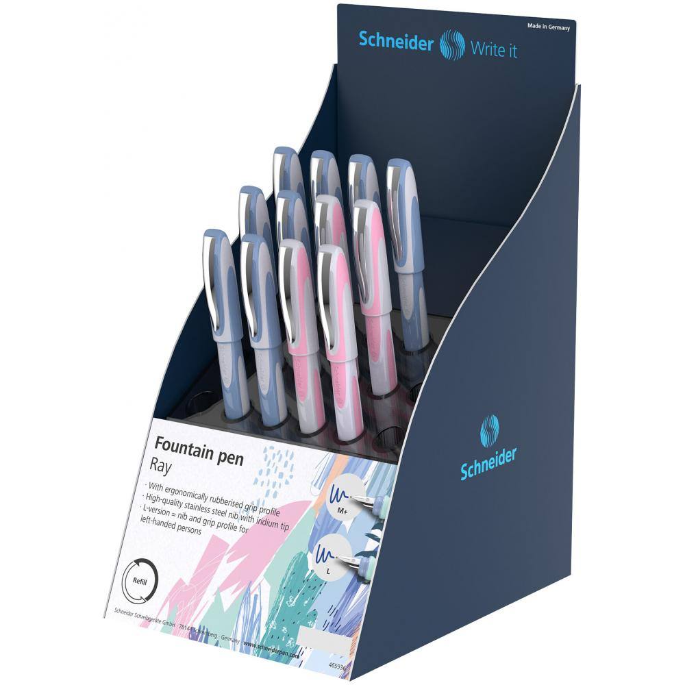 Nalivno pero Schneider Ray v pastelnih barvah.#13#10- Ergonomsko gumiran oprijem.#13#10- Iridijeva konica debeline M.#13#10- Privlačen moderni dizajn s čvrsto kovinsko sponko na pokrovčku.#13#10- Standardni črnilni vložki.#13#10- Za desničarje in levičarje.#13#10- V displeju 12 peres, mix barv.