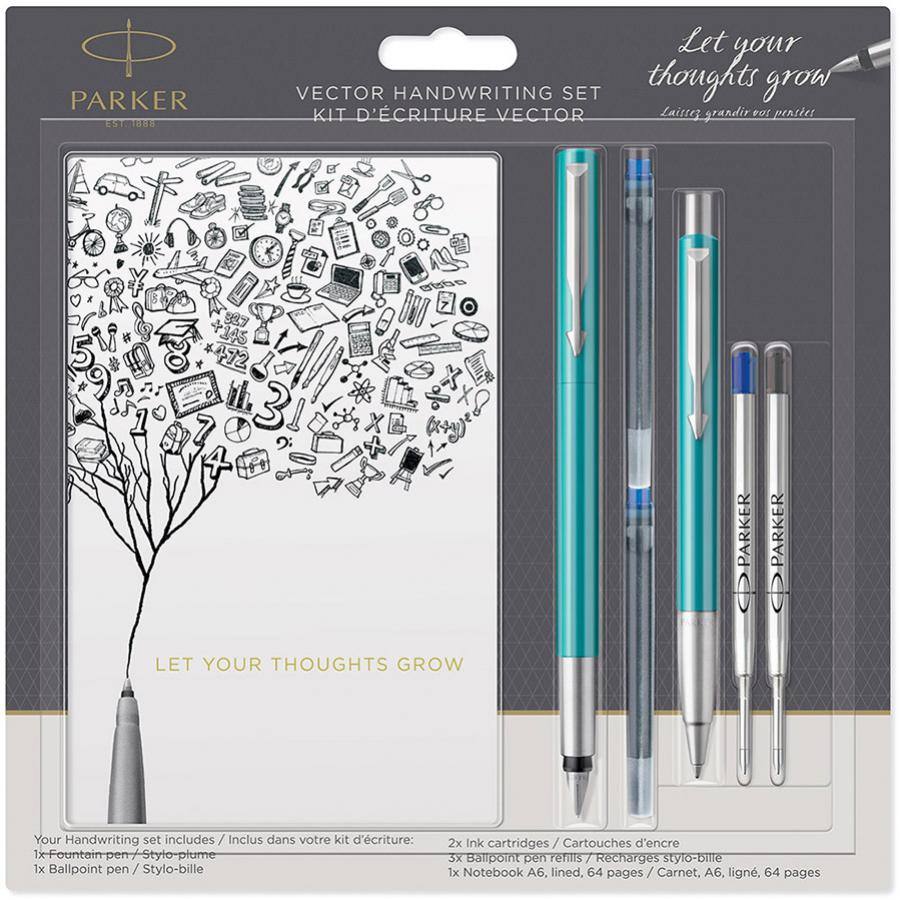 set Parker Vector vsebuje kakovostno nalivno pero, bombice, kemični svinčnik, refil za kemik v modri in črni barvi, notes A5 format. Seti so dobavljivi v črni, turkizni in modri barvi.