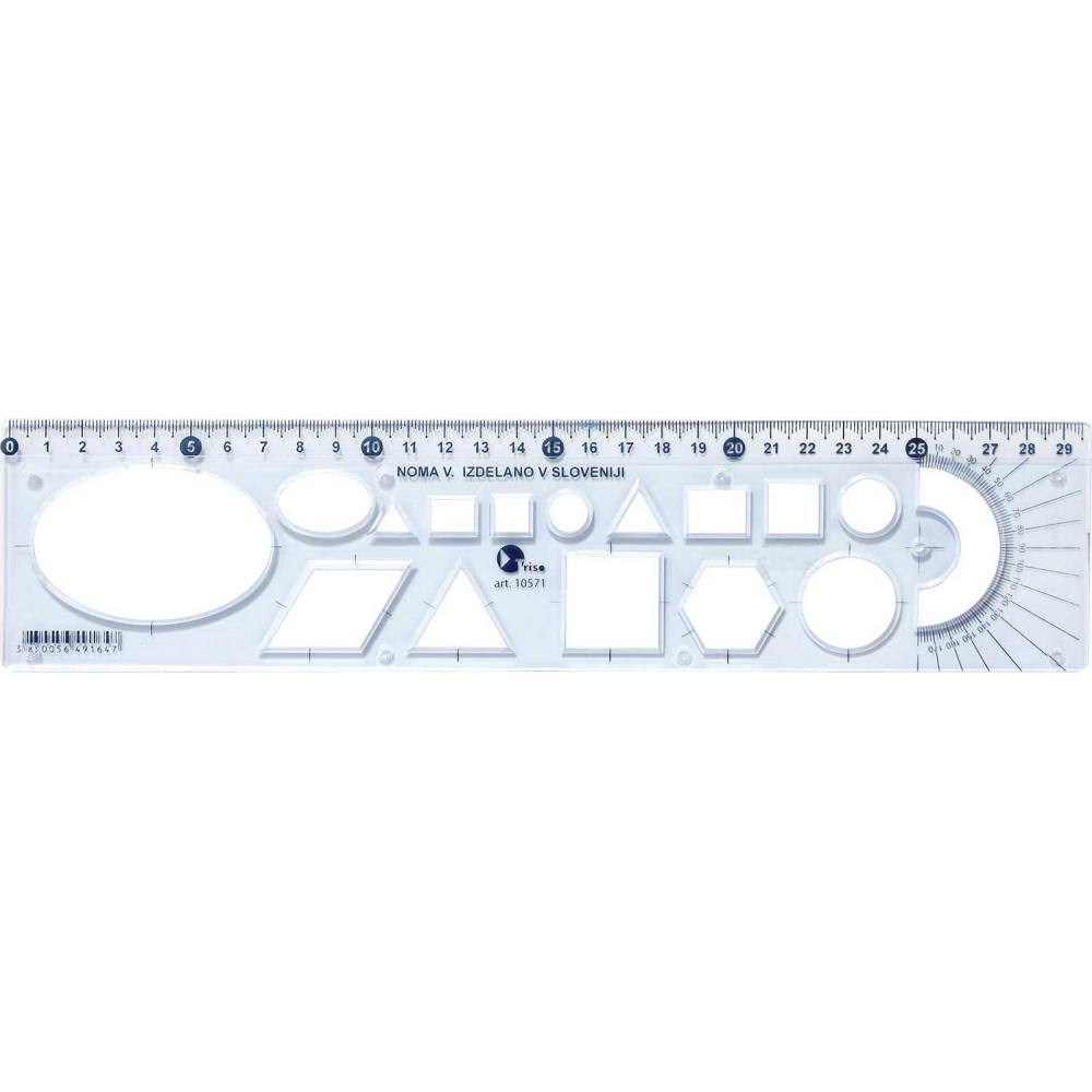 - Poleg merilne skale ravnilo vsebuje tudi šablone različnih likov.