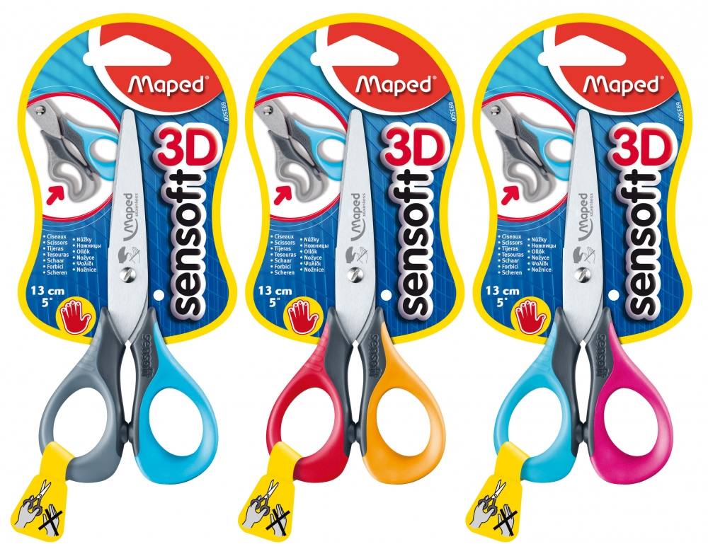 Škarje Maped Sensoft so škarje primerne za otroke 4+ in šolarje, velikost 13 cm, gumirano držalo. Škarje so primerne za levičarje.