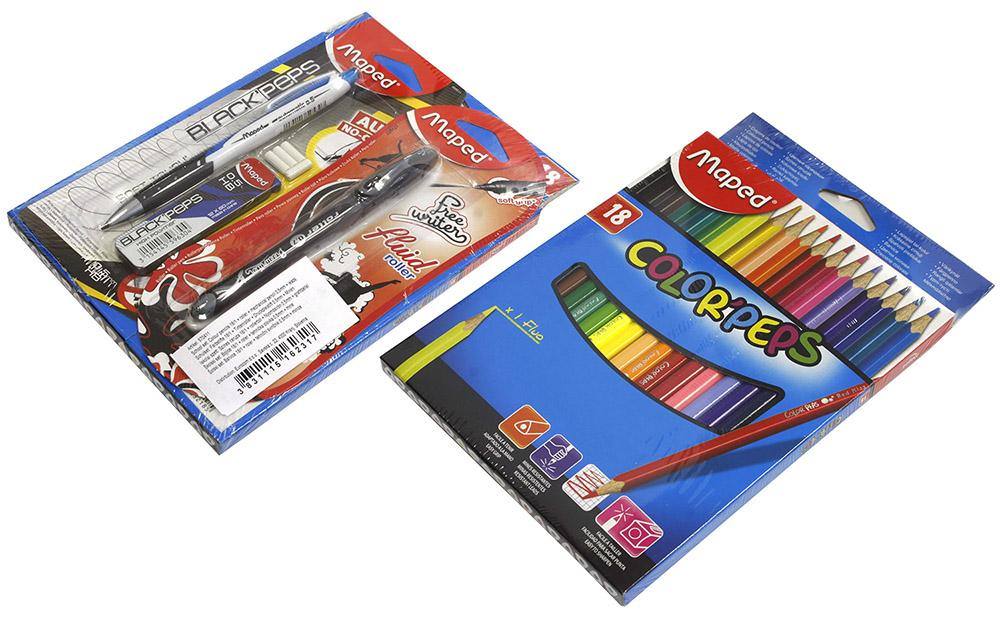 Set Maped vsebuje kakovostne barvice Maped z trirobno obliko za boljši in pravilnejši oprijem, mina je odporna na lomljenje in se z lahkoto ošili, barve pa so intenzivne. V kartonski embalaži je 18 različnih odtenkov. Svinčnik tehnični Maped z gumiranim oprijemom in roler Maped z gumiranim oprijemom v črni barvi.