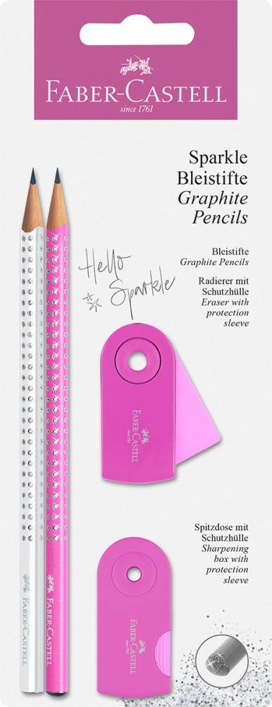 Set faber Castell Sparkle 4/1, ki vsebuje 2 Sparkle svinčnika ter Sleeve šilček in radirko.